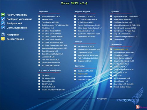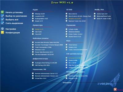 Zver WPI v1.9 - это образ, на котором предоставлены отдельно программы. Возможность использовать данный образ как отдельно с любым Windows так и интегрировать его в ZverCD Lego любой версии и получить на выходе ZverDVD! Способ интеграции очень прост. Список программ: