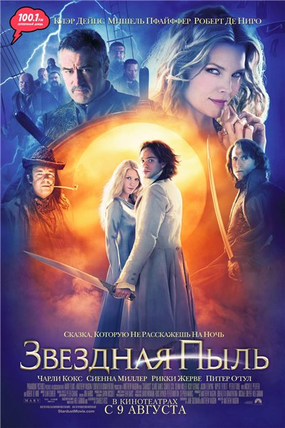 Информация о фильме Название: Звездная пыль Оригинальное название: Stardust Год выхода: 2007 Жанр: Приключения, драма, фэнтези Режиссер: Мэттью Вон В ролях: Чарли Кокс, Клер Дэйнс, Роберт Де Ниро, Сиенна Миллер, Мишель Пфайффер, Джейсон Флеминг, Питер О'Тул, Руперт Эверетт, Йен МакКеллен, Рикки Жерве, Хенри Кэвилл, Декстер Флетчер, Сара Александр, Марк Стронг, Дэвид Келли, Натаниэль Паркер, Мелани Хилл, Билли Уайтлоу, Джоанна Скэнлан, Джейк Керран, Марк Бернс, Фрэнк Эллис, Джордан Лонг, Марк Уильямс О фильме: Молодой человек по имени Данстан Торн жаждал обрести Мечту своего сердца. Жил он в городе З