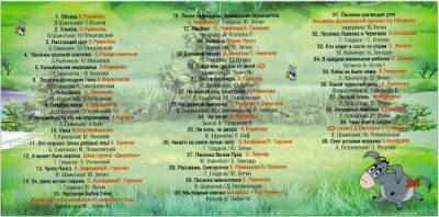 Название диска: Лучшие Детские песенки - Для всей семьи Жанр: Детские Год Выпуска: 2008 Количество треков: 40 Формат: CD (.bin + .cue) Качество: CBR CDRip (1411kbps) / 44100KHZ / STEREO Продолжительность: 01: 19: 56 мин Размер файла: 806.72 Мб TRACKLiST: 01. Румянова К. - Облака 02. Румянова К. - Улыбка 03. Румянова К. - Настоящий друг 04. О.Рождественская - Песенка Красной Шапочки 05. Ведищива А. - Колыбельная медведицы 06. В. Ферапонтов - Песенка Крокодила Гены 07. Румянова К. - Чебурашка 08. В. Ферапонтов - Голубой вагон 09. А. Калягин - Неприятность эту мы переживем! 10. Мария Коробейникова - Песенка Умки 11. А. Калягин - Это хорошо (Если добрый ты) 12. Гр. Гладков, Г. Случинская, дж - А может быть ворона 13. Аида Ведищева, Анатолий Горохо - Чунга-Чанга 14. Анофриев О. Горохов П. - Ох,рано встает охрана 15. Женская группа Московского кам - Частушки Бабок Ежек 16. Анофриев О. - Песня переодетых Бременских му 17. К. Румянова, А. Попанов - Айсберг 18. Мария Лукач - Антошка 19. Никитин С. Никитина Т. - Большой секрет 20. БДХ - Когда мои друзья со мной 21. А. Папанов - Песня Водяного 22. Румянова К. - Не волнуйтесь понапрасну 23. Никитин С,. Никитина Т. - На далекой Амазонке 24. Румянова Клара - Не везет 25. Румянова К. - Ни кола, ни двора 26. Анофриев О. Горохов П. - Ничего на свете лучше нету 27. Леонов Е. - Песенка Винни-Пуха 28. К. Румянцева, А. Папанов - Расскажи, Снегурочка 29. Румянова К. - Песенка Мамонтенка 30. ансамбль 'Рок-Ателье' - Мы бедные овечки 31. Ансамбль фольклерной музыки п/ - Песенка шагающих утят 32. Анофриев О. - Песенка Львенка и Черепахи 33. Леонов Е. - Кто ходит в гости по утрам 34. О.Шабина - В каждом маленьком ребенке 35. В. Толкунова - Кабы не было зимы 36. Румянова К. - Какой чудесный день 37. А. Ведищева - Лесной олень 38. Елена Понсова - Лягушачья ламбада 39. БДХ солист Дима Викторов с Э. - Чему учать в школе 40. Анофриев О. - Спят усталые игрушки  Инструкция: Перенесите файл (cue) в Nero или PowerISO, прожгите диск и наслаждайтесь!!! Download / Скачать: 806.72 Мб Sms4File Одним файлом без ограничений Vip-File Одним файлом на огромной скорости RapidShare Part 1 RapidShare Part 2 RapidShare Part 3 RapidShare Part 4 RapidShare Part 5 RapidShare Part 6 |