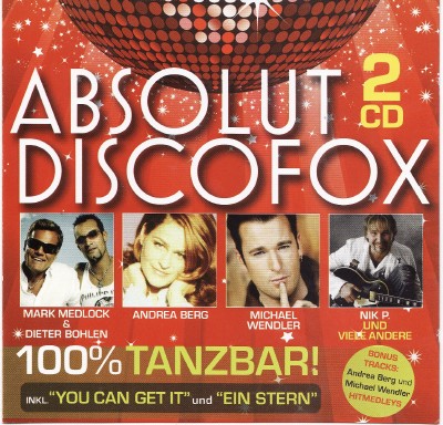 Исполнитель: VA Альбом: Absolut Discofox Дата выпуска: 14.02.2010 Стиль: Disco Количество композиций: 32 Время звучания: 120 Размер: 176 Mb Битрейт: VBR / 44.1kHz/ Joint-Stereo Tracklist: 1. Mark Medlock & Dieter Bohlen - You Can Get it 2. Nik P. - Ein Stern, Der Deinen Namen Traegt 3. Andrea Berg - Einmal Nur Mit Dir Alleine Sein 4. Die Flippers - Wetten Dass... 5. Nino De Angelo - Sarah 6. Roland Kaiser - Hit-Mix 7. Gamzebo - I Like Chopin 8. Fancy - Bolero 9. The Twins - Ballet Dancer 10. Boney M. - Going Back 11. Nicole - Wunderbar 12. Michelle - Dornrцschen Ist Aufgewacht 13. G.G. Anderson - Ich Bin Verliebt in Dich