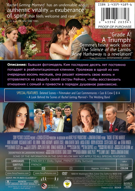 Название: Рейчел выходит замуж Оригинальное название: Rachel Getting Married Год выхода: 2008 Жанр: мелодрама, драма Режиссер: Джонатан Демме В ролях: Энн Хэтэуэй, Розмари ДеУитт, Мэтер Зикел, Билл Ирвин, Анна Дивер Смит, Anisa George, Танде Адебимпе, Дебра Уингер, Джером Лепаж, Бьяу Сия Описание: Бывшая фотомодель Ким последние д