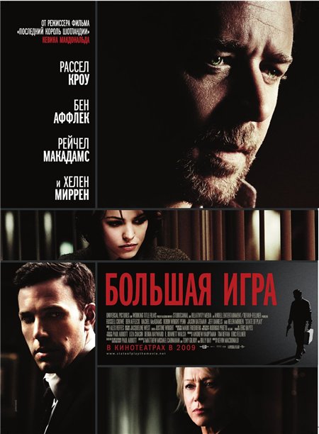 Название: Большая игра Оригинальное название: State of Play Год выхода: 2009 Жанр: Триллер, драма, криминал Режиссер: Кевин МакДональд В ролях: Рассел Кроу, Бен Аффлек, Рэйчел МакАдамс, Хелен Миррен, Робин Райт Пенн, Джейсон Бейтман, Джеф Дэниелс, Гарри Дж. Ленникс, Джош Мостел Описание: Фильм повествует о проведенном газетой расследовании убийства политического исследователя, оказавшегося любовницей министра энергетики. Нити преступления приводят репортеров к заговору между британским правительством и представителями нефтедобывающей промышленности. Рейтинг IMDB: 7.9/10 (2,214 votes) Вып