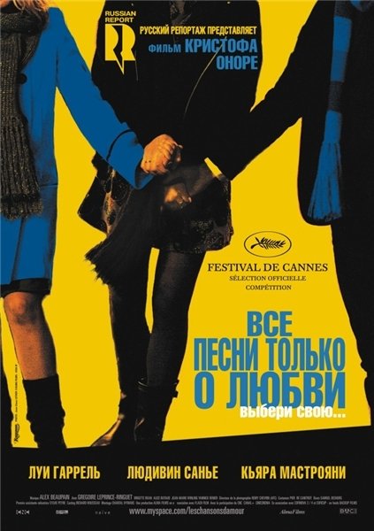 Год выпуска: 2007 Жанр: Драма, мюзикл Режиссер: Кристоф Оноре В ролях: Луи Гаррель, Людивин Санье, Кьяра Мастроянни, Клотильда Хесме, Грегуар Лепренс-Ренге, Янник Ренье Описание: Начинающий журналист Исмаэль любит улыбчивую блондинку Жюли дружит с ее сестрой и ходит на обеды к ее родителям. Затасканность этой идиллии компенсируется тем, что вечерами в гости к Исмаэлю с Жюли приходит задорная брюнетка Алис — и остается ночевать в их кровати. Рейтинг IMDB: 7.1/10 (1,468 votes) Выпущено: Франция Продолжительность: 01:31:42 Перевод: Профессиональный (многоголосый, закадровый)