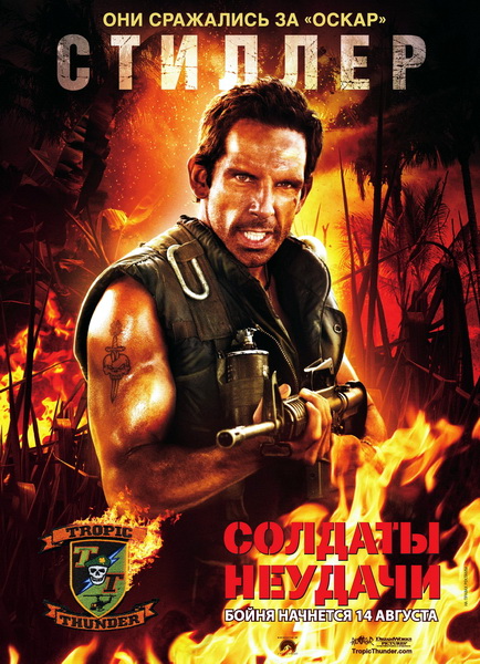 IMDB Rating: 7.6/10 (40,392 votes) Камера. Мотор. Начали! В реальных джунглях проходят съемки суперблокбастера с участием больших звезд, среди которых: крутой герой боевиков, мастер туалетного юмора, чернокожий рэппер Альпа Чино и обладатель всех кинопремий, специально для фильма перекрасивший кожу в черный цвет. Когда у продюсеров закончились деньги и съемки были остановлены – актерам про это не сказали. Поэтому они с холостыми патронами с легкостью вступают в неравный бой с настоящими вооруженными до зубов бандитами-головорезами... Информация о фильме Название: Солдаты неудачи Оригинальное название: Tropic Thunder Год выхода: 2008 Жанр: Боевик, комедия, военный Режиссер: Бен Стиллер В ролях: Бен Стиллер, Роберт Дауни